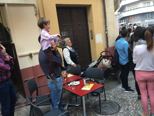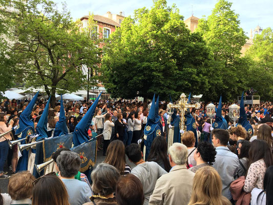 In Granada heißt es von Palmsonntag bis Ostermontag: Jeden Tag eine Prozession durch die Stadt. Jeweils beginnend von einem anderen Ortsteil hin zur Kathedrale und zurück. Im Zentrum einer jeden Prozession steht dabei eine Figur (Schutzpatron) der jeweiligen Gemeinde. Die jeweilige Figur (als tonnenschwere Statur) wird durch unzählige Freiwillige bis zur Kathedrale und zurück zur Heimatgemeinde getragen. Das alles begleitet von Musik, allerlei fremdartig bemützten Begleitern, schwarz gekleideten Frauen und sonstigen Honoratioren der Gemeinde. Egal wie man selbst zu kirchlichen Dingen steht und was man von solchen Bräuchen hält. Ein Riesenspektakel. Wir haben uns deshalb am Samstag an die Strecke begeben, um uns einen Eindruck zu verschaffen.