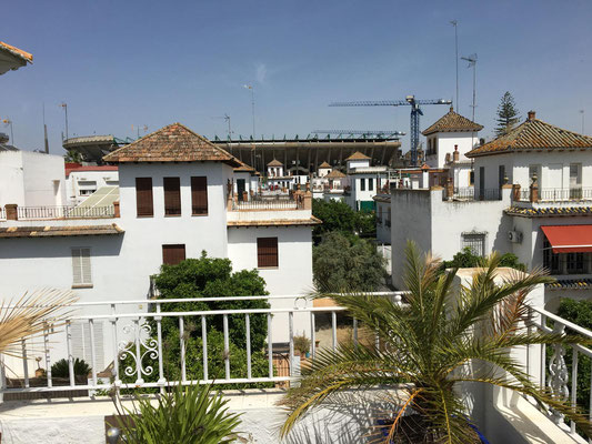 Wir fahren mittags in Ronda los, an der nächsten Sierra (linke Hand) vorbei direkt nach Sevilla. Keine 2 Stunden gemütliches Zuckeln und wir sind in unserem kleinen Hotel. Eine ehemalige Villa, nur 7 Zimmer klein, 10 min. mit dem Bus von der Altstadt und in Sichtweite des Betis Stadions (2. Klub Sevillas in der ersten spanischen Liga).