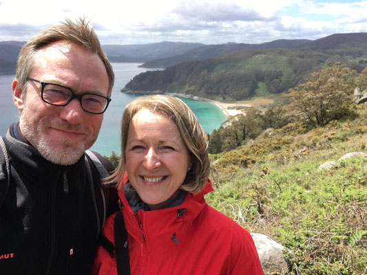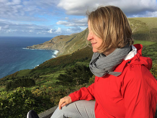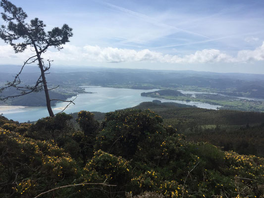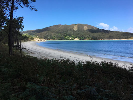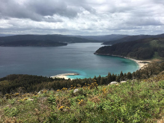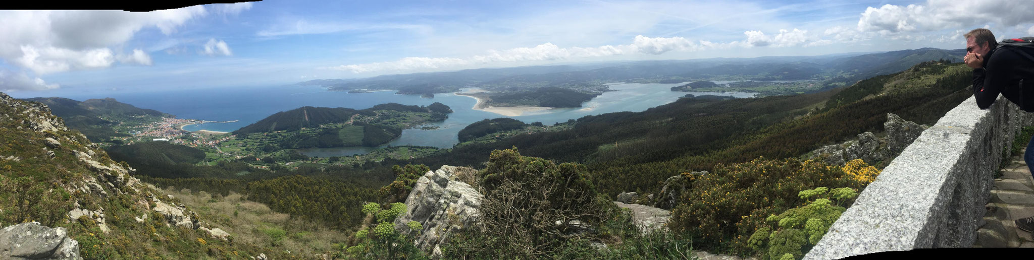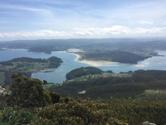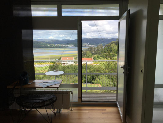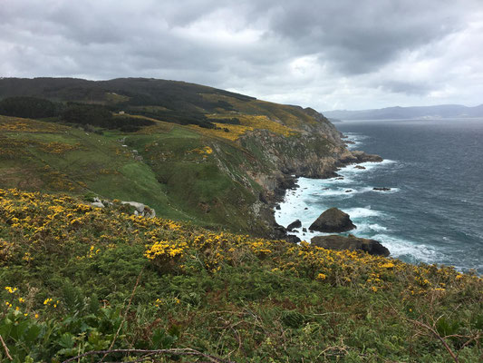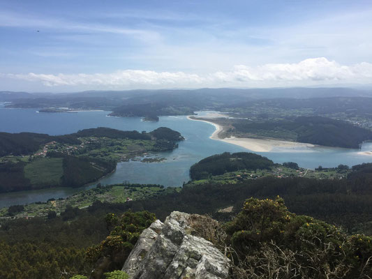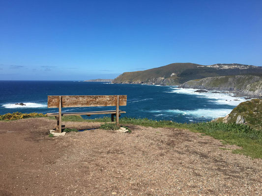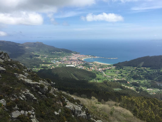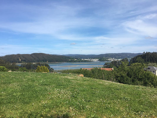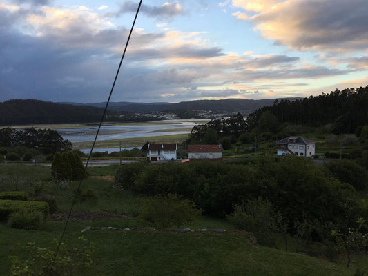 Wir machen uns gegen Mittag (18.05.) auf, um nach Galicien, den alleräußersten nordwestlichen Zipfel Spaniens zu fahren. Hier gibt es außer Natur nicht viel, weiß ich aus dem Fernsehen. Die soll aber sehr schön sein. Wir haben uns deshalb keinen größeren Ort mit Rambazamba gesucht, den gibt es hier nämlich nicht. Stattdessen gibt es ein 14-Quadratmeter-Zimmer mit Blick auf die Bucht (auch aus der Dusche!!!) in einem kleinen Hotel mit nur 7 Zimmern. Der Ort heißt Feas und gehört zur Gemeinde Carino (heißt auf spanisch "Zuneigung"). Die ganze Gemeinde zählt mit allem, was sich noch bewegt, ca. 4.000 "Einwohner". Sehr nett hier und friedlich.