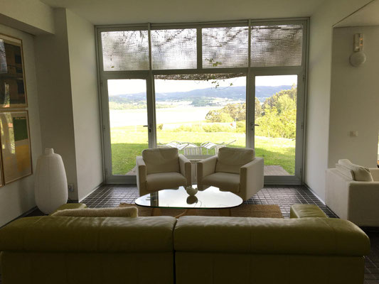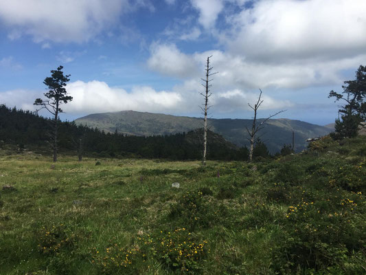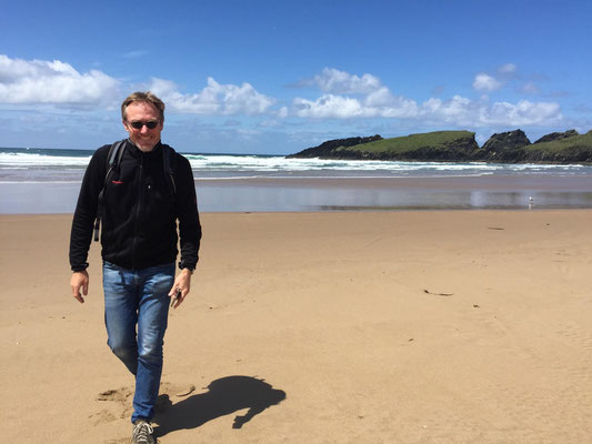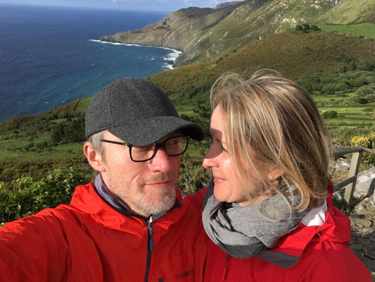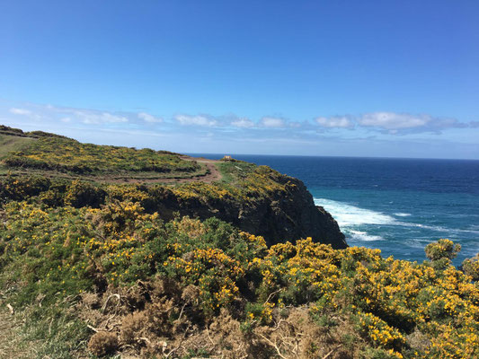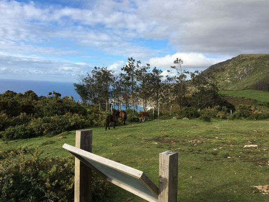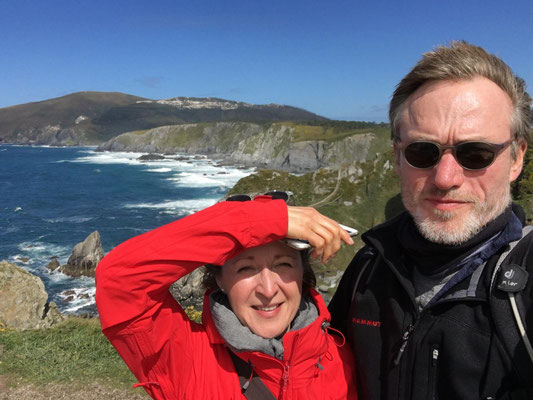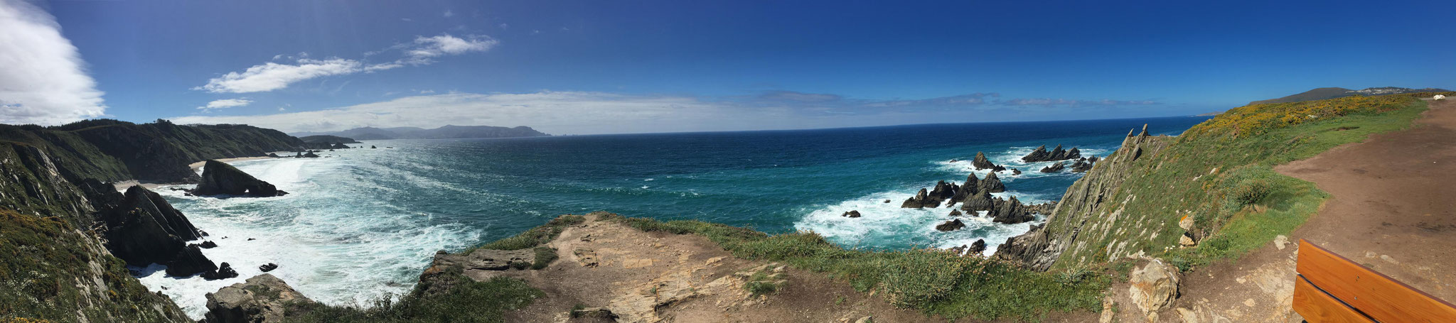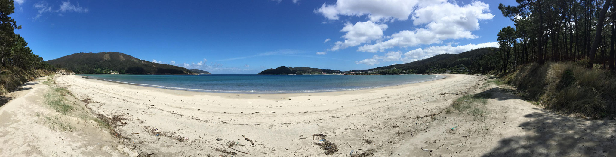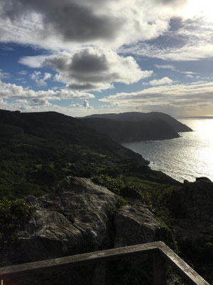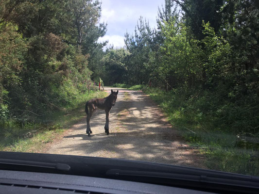 Wir machen uns gegen Mittag (18.05.) auf, um nach Galicien, den alleräußersten nordwestlichen Zipfel Spaniens zu fahren. Hier gibt es außer Natur nicht viel, weiß ich aus dem Fernsehen. Die soll aber sehr schön sein. Wir haben uns deshalb keinen größeren Ort mit Rambazamba gesucht, den gibt es hier nämlich nicht. Stattdessen gibt es ein 14-Quadratmeter-Zimmer mit Blick auf die Bucht (auch aus der Dusche!!!) in einem kleinen Hotel mit nur 7 Zimmern. Der Ort heißt Feas und gehört zur Gemeinde Carino (heißt auf spanisch "Zuneigung"). Die ganze Gemeinde zählt mit allem, was sich noch bewegt, ca. 4.000 "Einwohner". Sehr nett hier und friedlich.