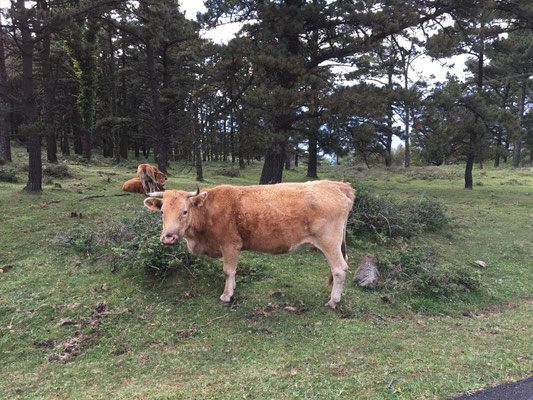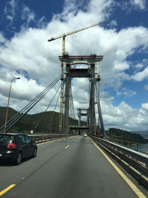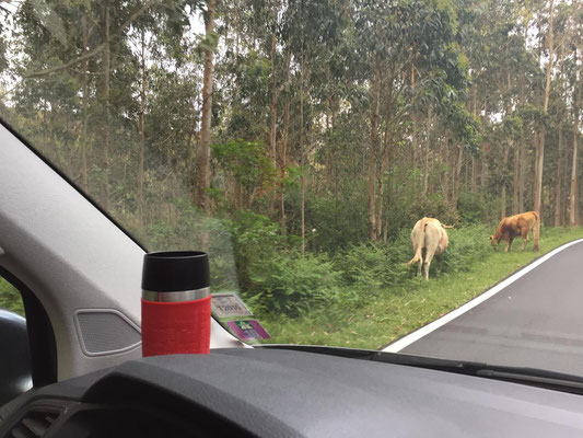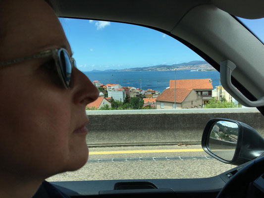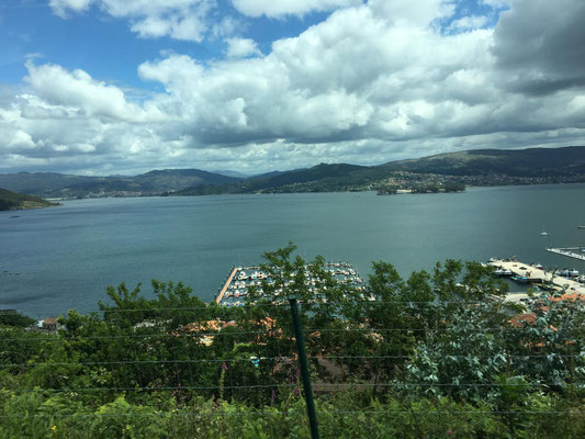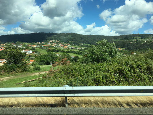 Das habe ich noch vergessen: die Überfahrt. Die Landschaft wird immer grüner und hügeliger (:o)). Dann tauchen die ersten Kühe mit großen Glocken um den Hals auf. Die Häuser sehen plötzlich aus wie in Österreich oder Bayern. Was'n los hier? Sieht gar nicht mehr nach Spanien aus. Später schauen wir uns ein paar Berichte von anderen Reisenden an... Auch ihnen ist es aufgefallen. Galicien scheint eine Exklave von Bayern zu sein, echt witzig.