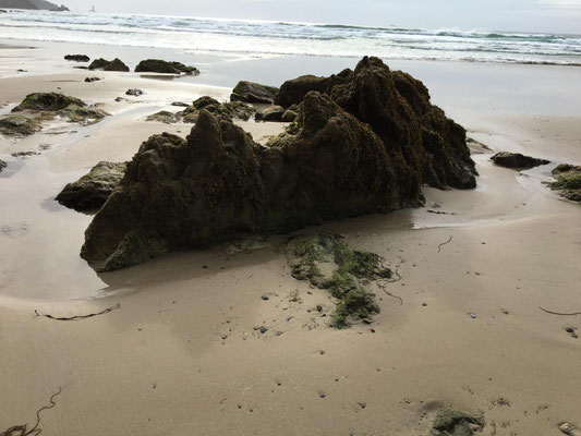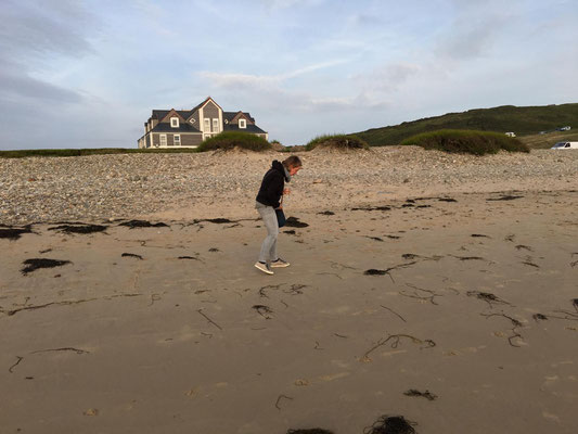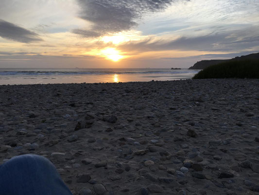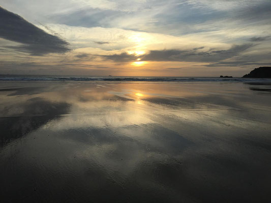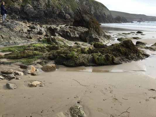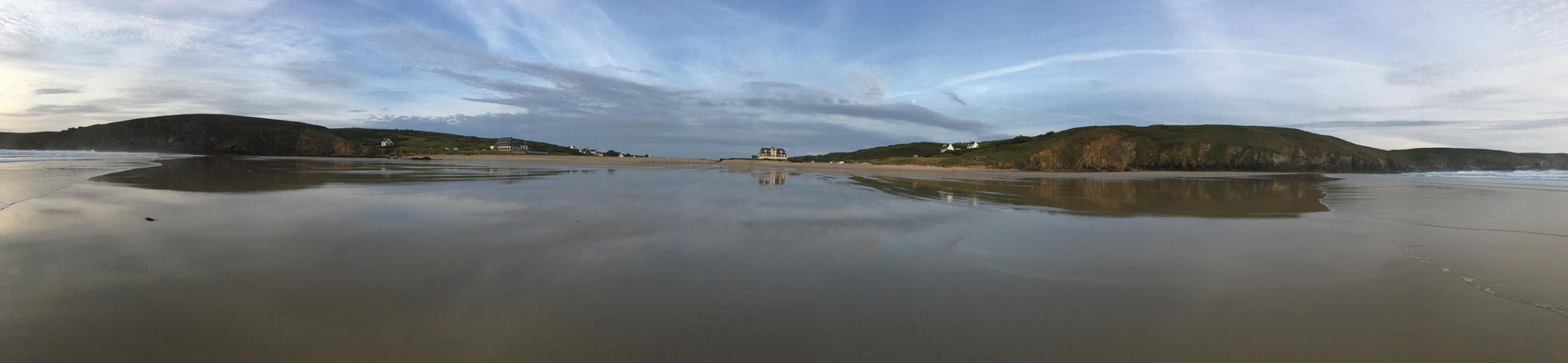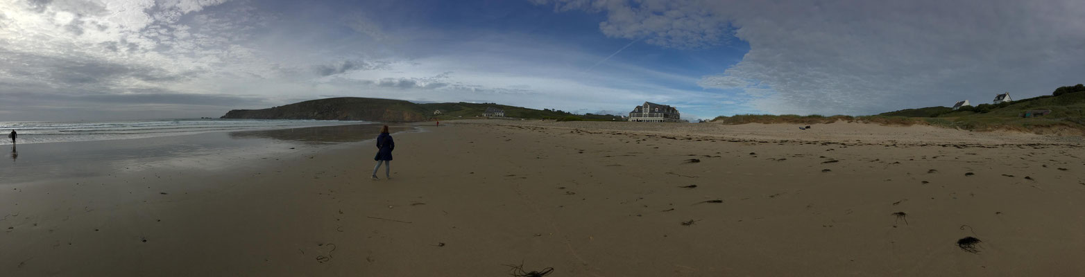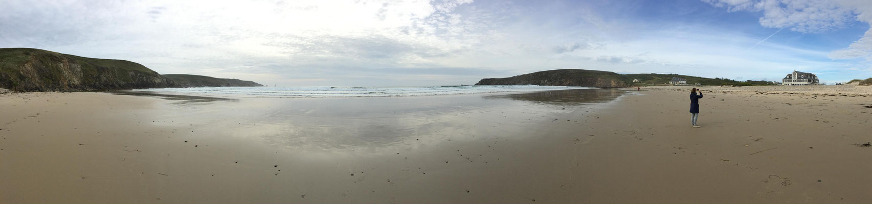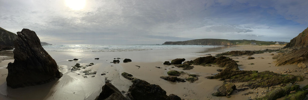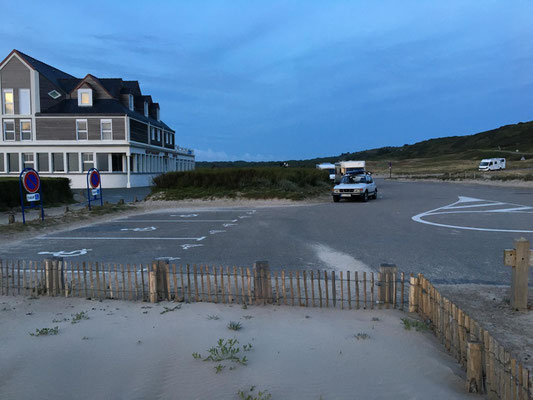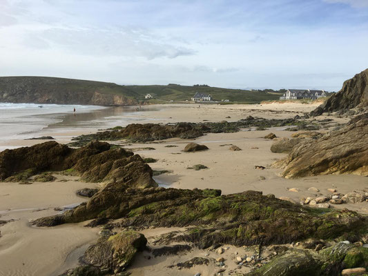 Wir fahren noch 5 Minuten weiter und erreichen unsere Unterkunft: Ein kleines Hotel, das alleine mitten in der Bucht Baie des Trépassés liegt. Das ist wirklich einzigartig. Die kleine Bucht liegt zwischen der Pointe du Raz und der Pointe du Van in der Gemeinde Plogoff.