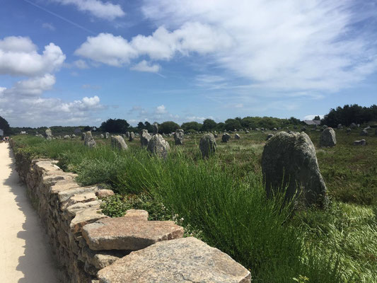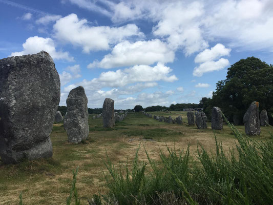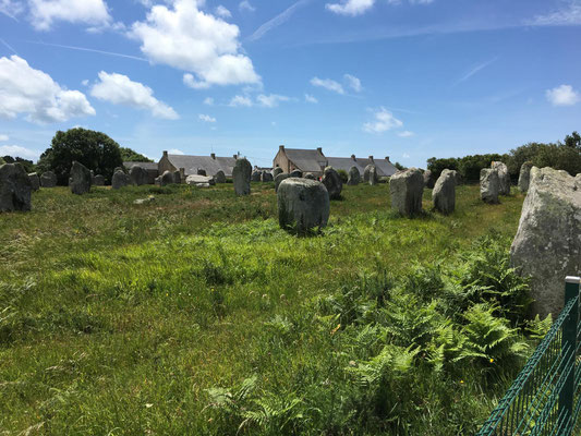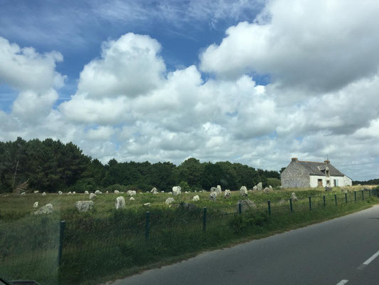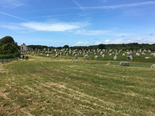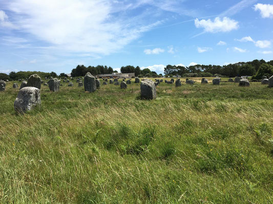 Carnac ist ein kleines Städtchen, etwa auf der Hälfte unserer heutigen Strecke. Eigentlich gibt es hier außer Landschaft nicht sehr viel zu sehen. Eigentlich, denn es gibt hier kilometerlange Steinfelder (Alignements de Carnac). In dieser Art sind sie die größten Megalith-Anlagen der Welt. Die Menhire (aufrecht stehende, große Steine) wurden hier um 4.500 vor unserer Zeitrechnung aufgestellt. Heute sind davon noch weit über 2.800 Steine in mehreren Gruppierungen zu sehen, auf einer Fläche von 40 Hektar und einer Länge von 4 Kilometern.