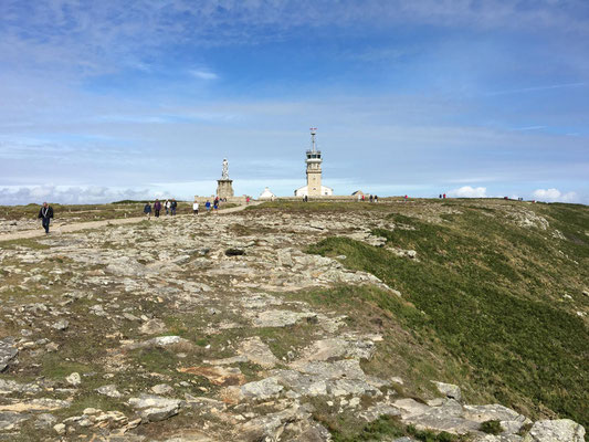 Hier mal wieder etwas Hintergrund für die Interessierten (für alle anderen: Bilder anschauen): Die Pointe du Raz ist ein felsiges Kap im Westen der Gemeinde Plogoff im Département Finistére in der Bretagne. Die schroffe Klippe, die mit einer Höhendifferenz von 72 Metern ins Meer hinausragt, ist eine der charakteristischsten Pointes der bretonischen Küste. Sie ist ein touristischer Anziehungspunkt von großer internationaler Bekanntheit. Acht Kilometer westlich befindet sich die Île de Sein, die durch eine von gewaltigen Strömungen durchquerte Meerenge von der Pointe du Raz getrennt ist (das Wort raz bezeichnet im Bretonischen eine besonders heftige Meeresströmung). Zwei heute unbewohnte Leuchttürme befinden sich auf zwei Inselchen. Eine Statue der Notre-Dame des Naufragés (Mutter Gottes der Schiffbrüchigen) und ein Signal befinden sich am Ende des Plateaus.