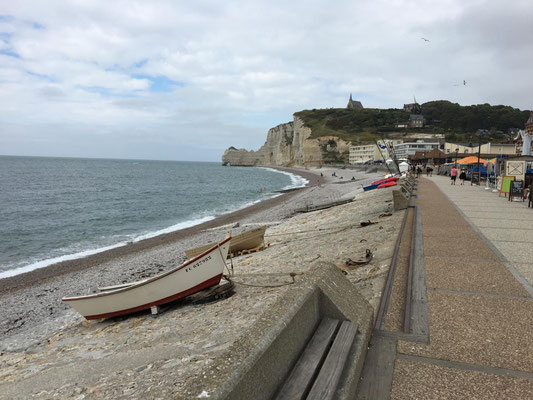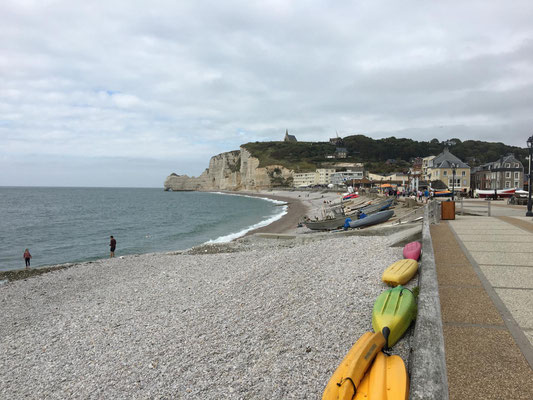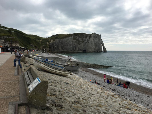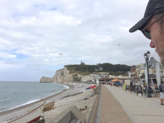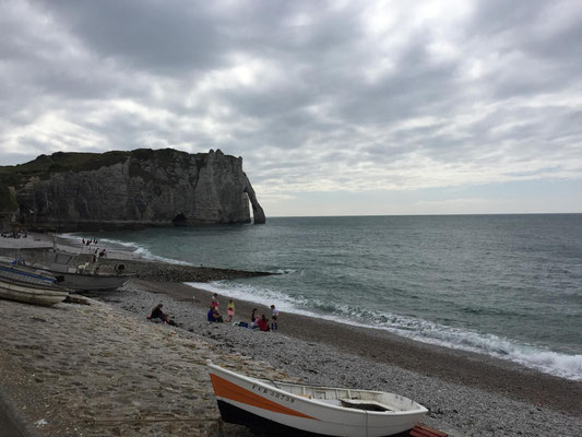 Bevor wir zu unserer Unterkunft der nächsten 3 Tage fahren, machen wir noch einen kurzen Abstecher nach Étretat. Ein kleines Seebad mit 1398 Einwohnern (Stand 1. Januar 2014), das vor allem durch die steilen Felsklippen mit ihren außergewöhnlichen Felsformationen, die den Ort auf beiden Seiten einrahmen, bekannt ist. Wie machen schnell ein paar Fotos und fahren zu unserer Herberge.