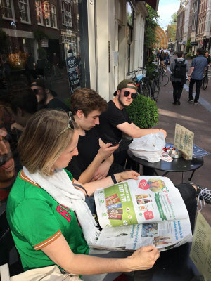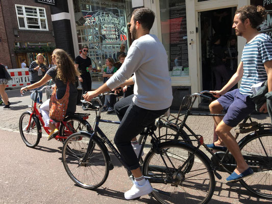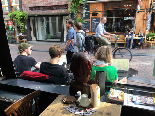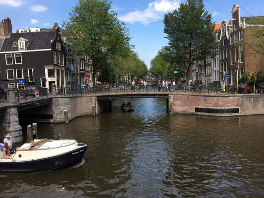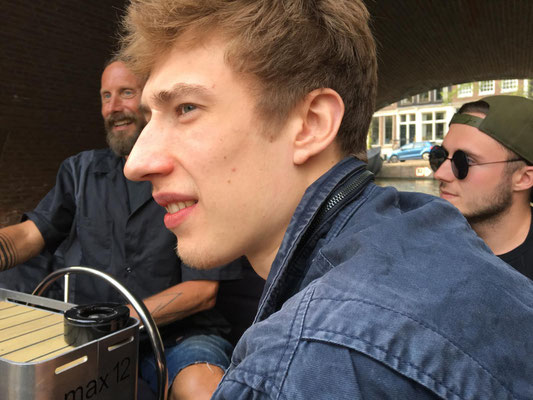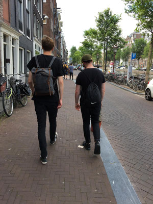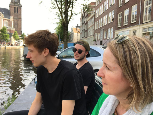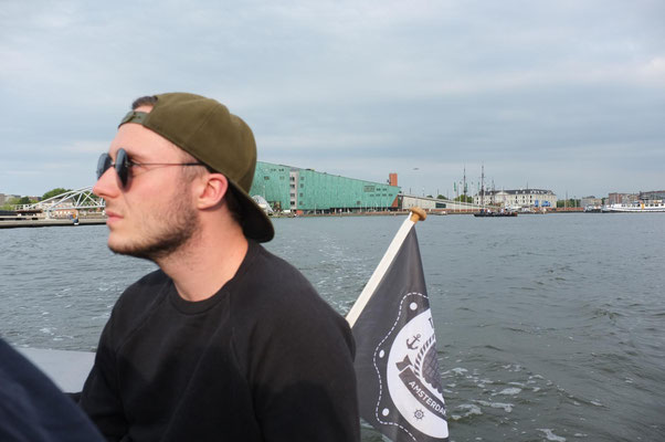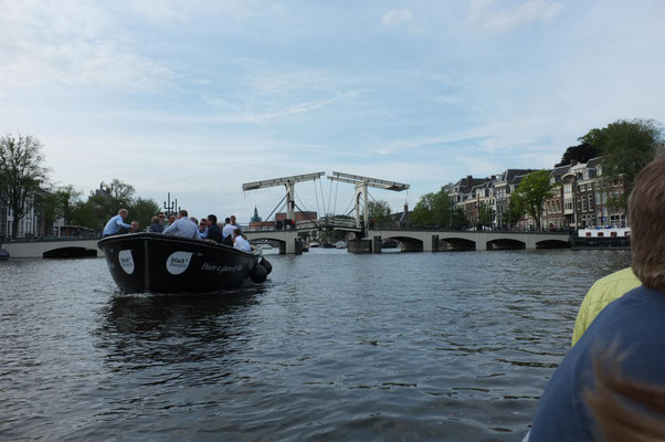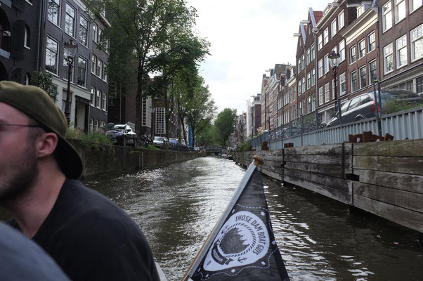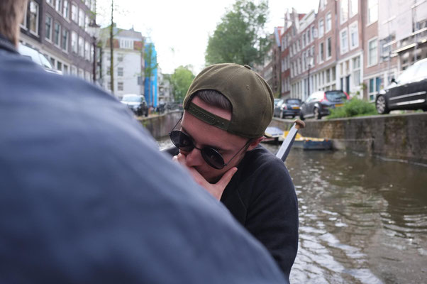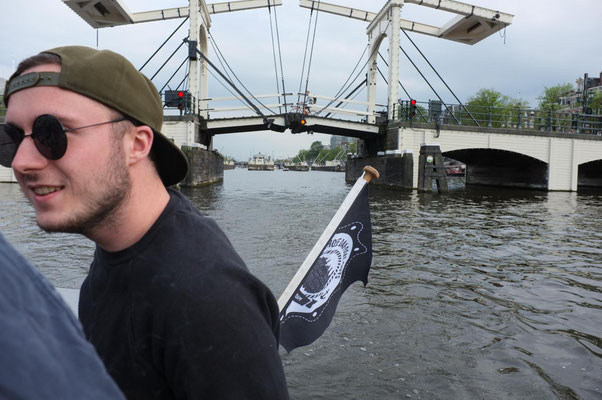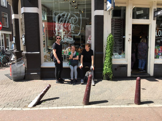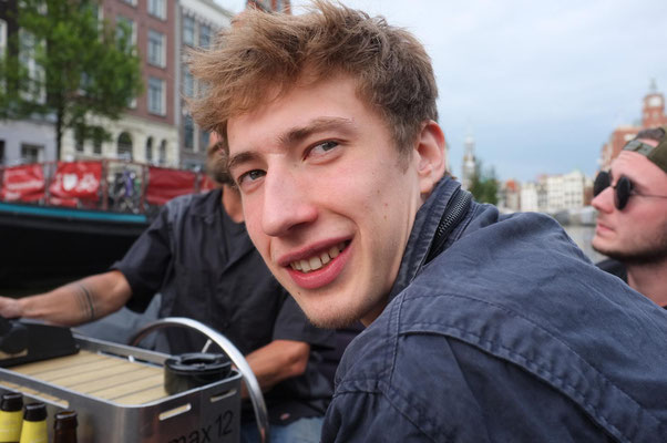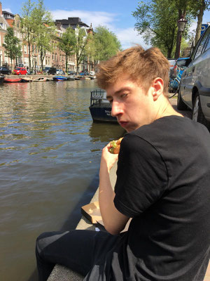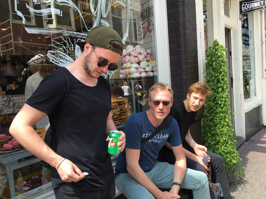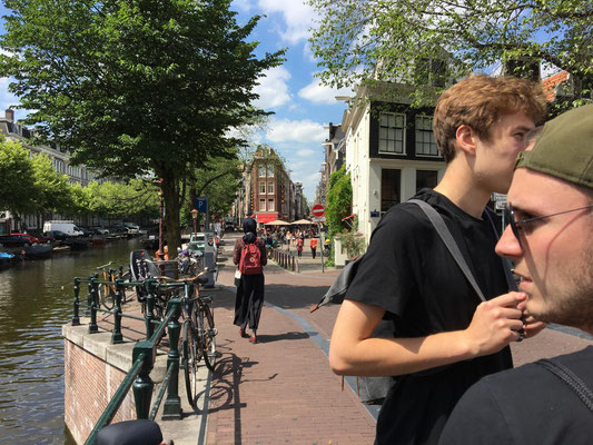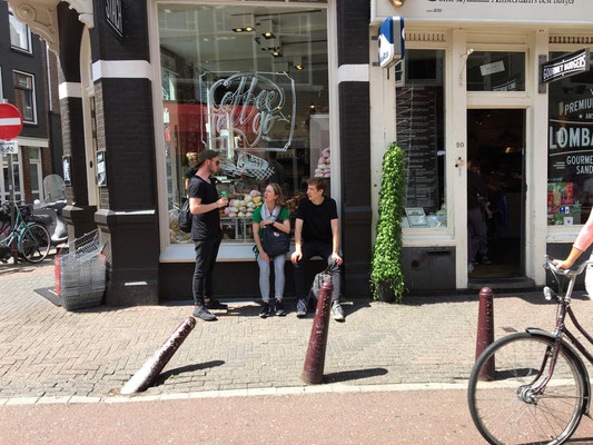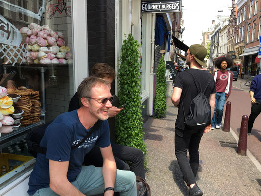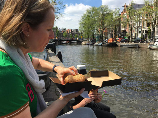 Nach Banksy ist vor dem Burger. Wir ziehen weiter Richtung Innenstadt und suchen den Burgerladen vom Vortag auf. Der Laden hat heute zu unserer großen Freude auf und sichert uns ein kleines Picknick an den Grachten. Danach stromern wir noch in getrennten Gruppen durch Amsterdam, um am Abend gemeinsam eine kleine Bootstour zu machen.