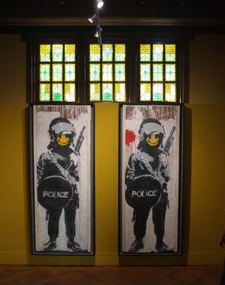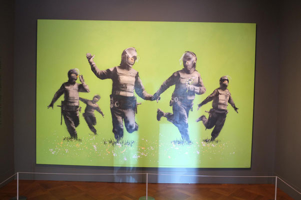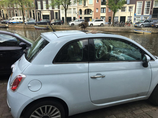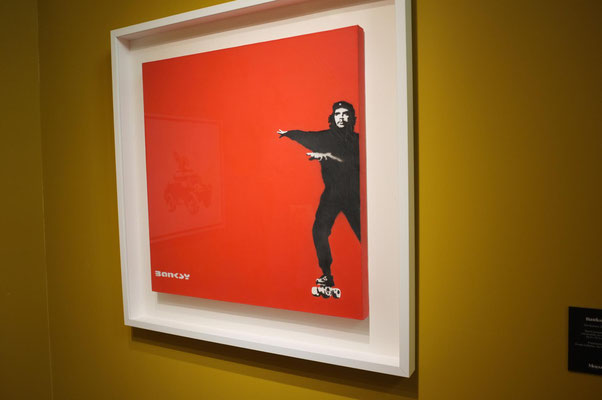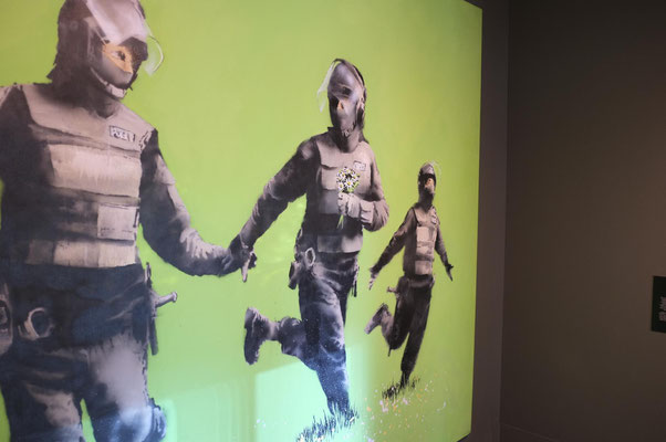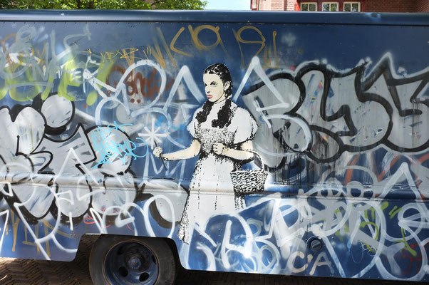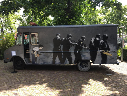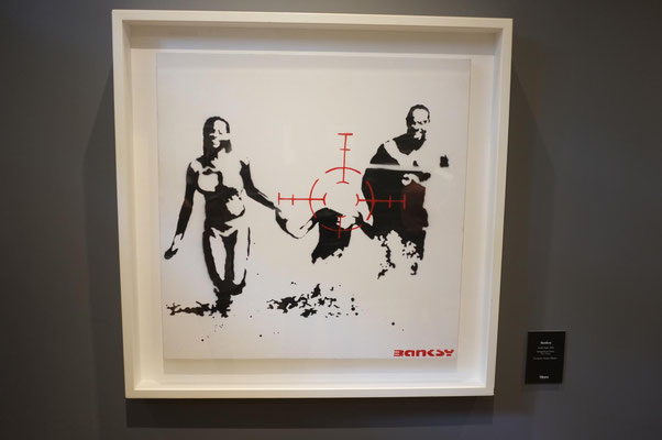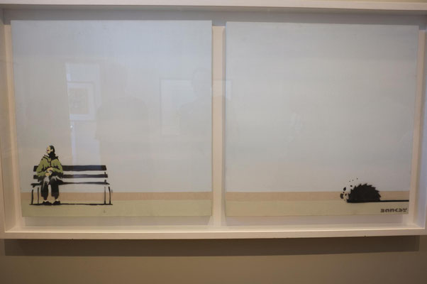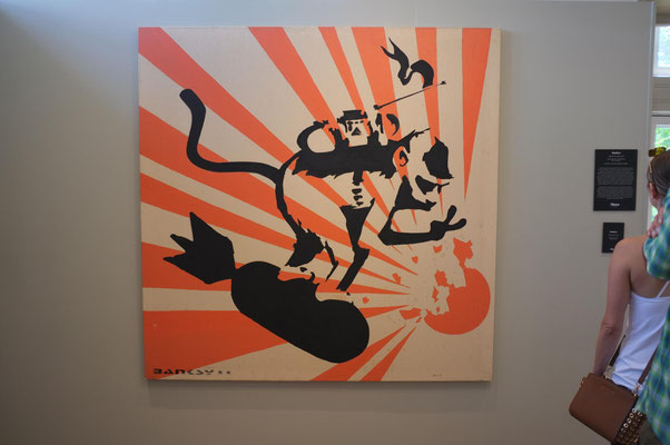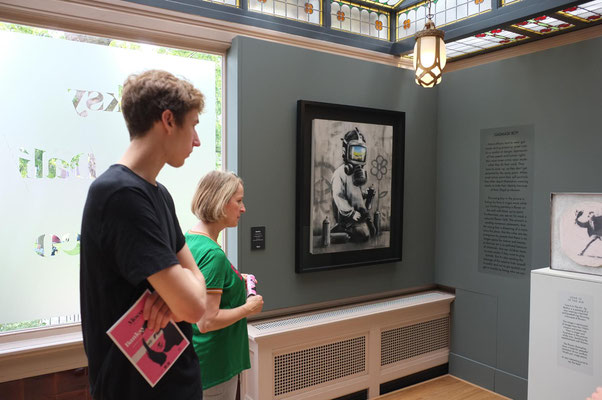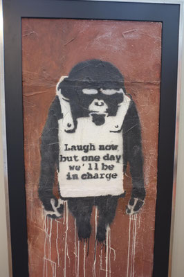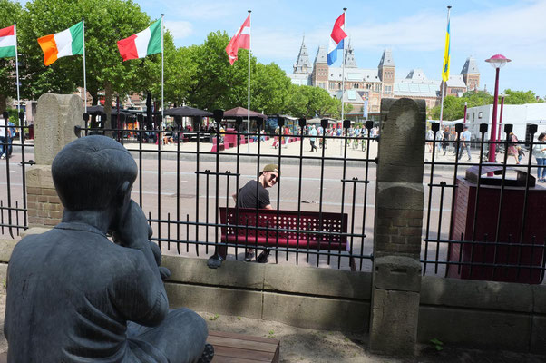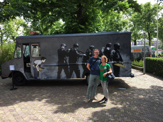 Da wir vier nicht nur zum Spaß in Amsterdam verweilen, haben wir uns heute tatsächlich ein straffes Programm verordnet. Das heißt, die jungen Erwachsenen haben unseren Vorschlägen nicht zu sehr widersprochen und kommen mit uns auf die Rolle. Im Gegenzug lassen wir sie ausschlafen. Nach dem Frühstück geht es zu Fuß an einigen Grachten vorbei zum Museumplein. Das Rijksmuseums, wollen wir aufgrund der Größe, den beiden Jungs, aber auch uns, nicht zumuten. Van Gogh haben wir beim letzten mal schon besucht, deshalb gehen wir ins MOCO Museum. Ein eher kleines Museum mit einer Ausstellung von Banksy und Dali. Von der Banksy-Ausstellung sind wir alle vier doch ziemlich angetan. Können wir Euch nur empfehlen. Kleine Anmerkung: Aktuell gibt es auch Banksy-Ausstellung in Berlin: theartofbanksy.de. Die Ausstellung über Dali lassen wir aus.