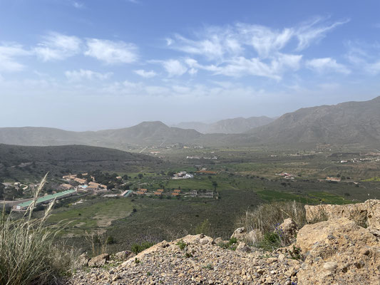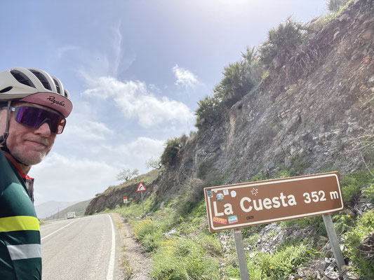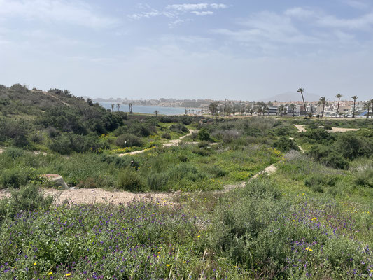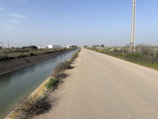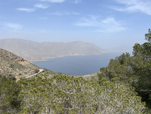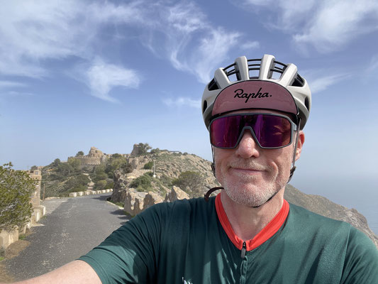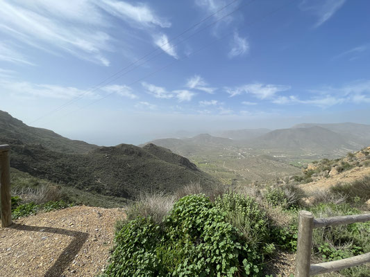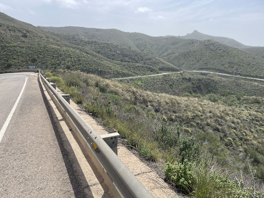 Mein Weg, bis zur Küste, geht durch die Anbaugebiete um Murcia. Die Straßen sind einsam und holpriger als ich es erwartet habe. Je länger die Tour dauert, um so wärmer wird es. Die Ausblicke sind toll und werden immer besser. Mit dem Rückenwind auf dem Hinweg macht das Radfahren unglaublich Spaß. Auf der ganzen Strecke sehe ich, mit Ausnahme der Küstenstraße, wo es etliche E-Biker gibt, nur eine handvoll Radfahrer.