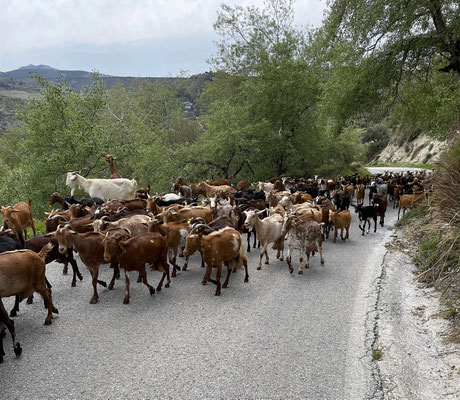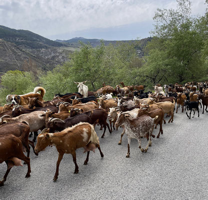 Die Ziegen wurden nur von zwei Hunden begleitet, ohne Schäfer. Wobei ein Hund sich sozusagen in den Ziegen versteckt hat.