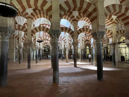 verzieren. Die letzte Reform wurde von Almanzor im Jahre 987 durchgeführt. Das Ergebnis ist ein wunderschönes Säulenlabyrinth mit Doppel- und Hufeisenbögen im Inneren. Nach der Reconquista durch