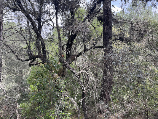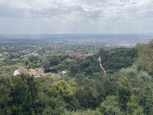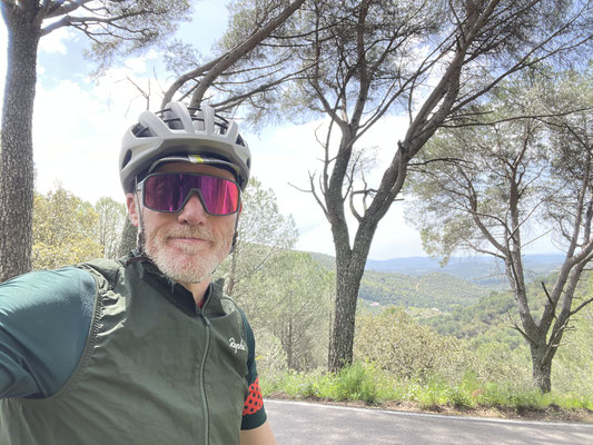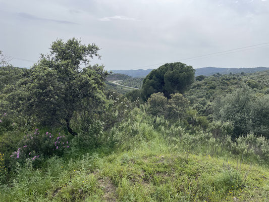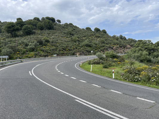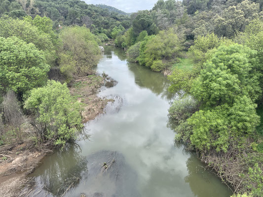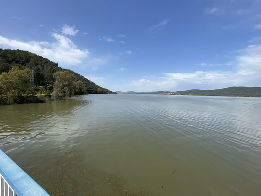 Hinterm Hotel geht es ca. 15 km, unterbrochen von einer kurzen Abfahrt, bergauf. Der Verkehr lässt nach, sobald ich aus der Stadt herausfahre, die Landschaft wird schöner und ab und an treffe ich sogar einige Rennradfahrer. Ich genieße die Landschaft und die Ruhe dieser Strecke. Dieses Mal sehe ich die Olivenhaine nur aus der Ferne, dafür fahre ich durch eine Hügellandschaft aus Pinien. Nach ca. 42 km bin ich an meinem Zwischenziel einem Staudamm angelangt. Der Staudamm ist nach den Regenfällen der letzten Wochen randvoll. Ab hier geht es noch einmal 50 km zurück zu Hotel. Noch einige Meter bergauf, aber meistens entspannt bergab.