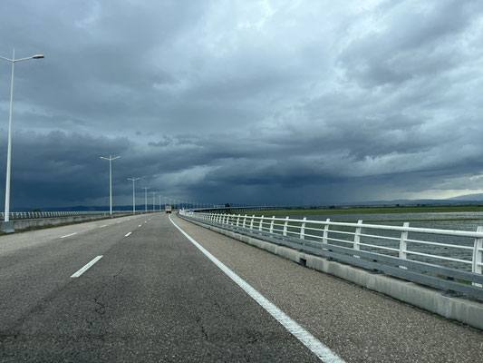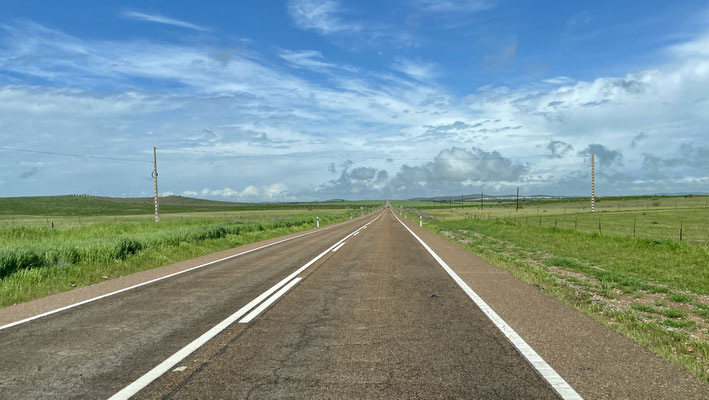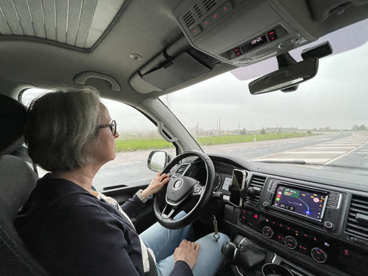 Wir frühstücken, packen den Wagen, der direkt vor dem Hotel steht und fahren los. Knapp 600 km stehen heute an. Es fängt zwischendurch ein wenig an zu regnen, für einen Transfertag in Ordnung. Bis zur Grenze ist es eine weite und platte Landschaft, geprägt vom Weinanbau. Die Straßen sind oftmals über Kilometer schnurgerade, eine Weite, die man in Europa nur selten antrifft.
