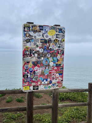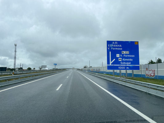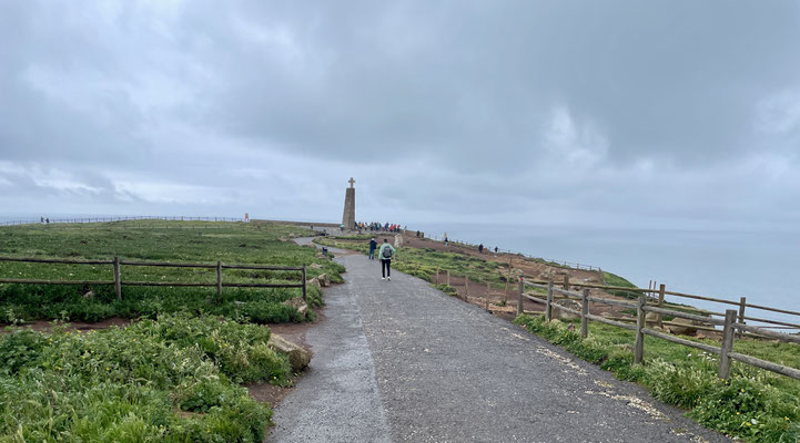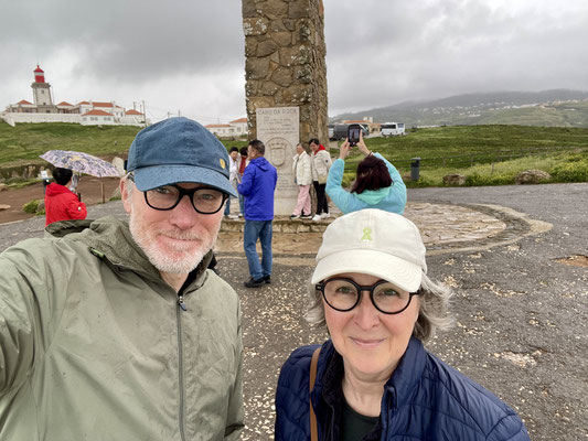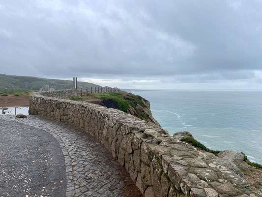 Wir fahren los und machen einen kleinen Abstecher zum Cabo da Roca, denn auch Sonja soll den westlichsten Punkt Kontinentaleuropas abhaken können. Die Fahrt vom Haus zum Kap dauert nur 5 Minuten. Es ist erst 9:30 Uhr als wir ankommen. Und obwohl es leicht regnet, sind wir nicht die Ersten. Es bildet sich schon am frühen Morgen eine Selfieschlange vor dem Denkmal. Verrückt. Wir machen unser Selfie - für euch, liebe Gemeinde - aus entsprechender Entfernung. Anschließend werfen wir noch einige Blicke in die zwei Souveniershops und werfen unseren Hausmüll - ordnungsgemäß - in die aufgestellten Container vor Ort. Über Sintra geht es auf die Autobahn: Richtung Spanien.