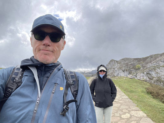 Sonja hat mir vor der Fahrt ein paar Infos geschickt, die ich mir allerdings nicht angeschaut habe. Ich bin deshalb auch einigermaßen erstaunt, dass man nicht komplett zu den Seen hochfahren kann, als uns in Covadonga eine Schranke die Zufahrt verweigert. Ab hier gibt es zwei Alternativen: Der Linienbus oder ein Sammeltaxi. Wir nehmen das Sammeltaxi. Nach einer Wartezeit von ca. 20 min. haben sich 8 Leute für das Taxi gefunden, und die wilde Fahrt, den Berg hinauf, beginnt. Wir verstehen jetzt, dass es keinen Sinn macht, die Zufahrt zu den Seen für jeden zu erlauben; das Chaos wäre vorprogrammiert. Als wir am See ankommen, steht schon eine Schlange von ca. 30 Personen am Taxistand und wartet darauf, mit einem Sammeltaxi wieder nach unten gefahren zu werden. Wer mich - und meine Ungeduld - kennt, der weiß, dass mir solche Situationen nicht gefallen. Ich frage den Taxifahrer, der uns nach oben gebracht hat, ob wir uns zur Runterfahrt dort anstellen müssen, und wie lange es so im Schnitt dauert. Ja, man muss sich anstellen, und wenn man Pech hat, steht man ca. eine Stunde. Oh Gott. Ich bin nicht gerade tiefenentspannt nach dieser Info.