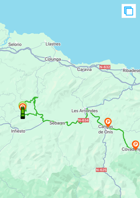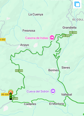 Auf der Rückfahrt begehe ich einen mittelgroßen Fehler. Anstatt die Strecke der Hinfahrt zu nehmen, wähle ich - aller Warnungen von Sonja zum Trotz - eine andere Strecke. Ich dachte, wenn ich auf einer zweispurigen Straße bleibe, die eventuell etwas länger ist, dann wird es hier im Hügelland von Asturien vielleicht etwas magenverträglicher. Großer Fehler. Die Strecke ist deutlich länger als die ursprüngliche und schlängelt sich zudem erbarmungslos durch die Landschaft. Sonja muntert es auch keineswegs auf, dass ich einen Teil der Strecke von der gestrigen Radtour kenne. Einige Zeit später kommen wir am Hotel an. Während ich mir einen Kaffee gönne, muss Sonja, etwas bleich um die Nase, erst einmal auf das Sofa. Kamillentee verbessert die Lage. Ich gebe zu, der Plan war nicht so doll. Die untere Kurve (linkes Bild) zeigt die Hinfahrt. Der gesamte obere Bogen meine auf der Rückfahrt gewählte Strecke. Mea culpa.
