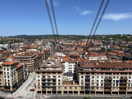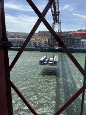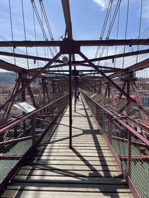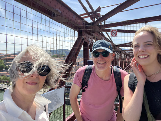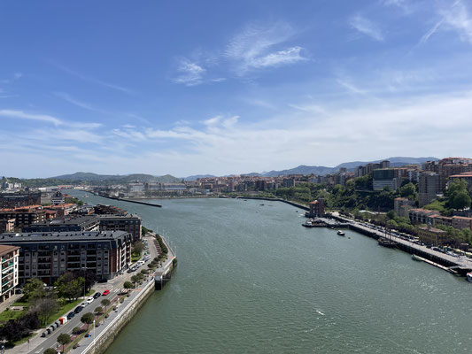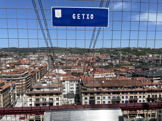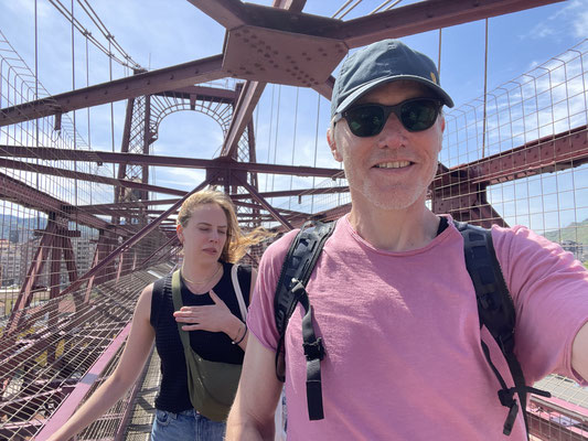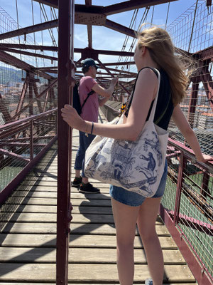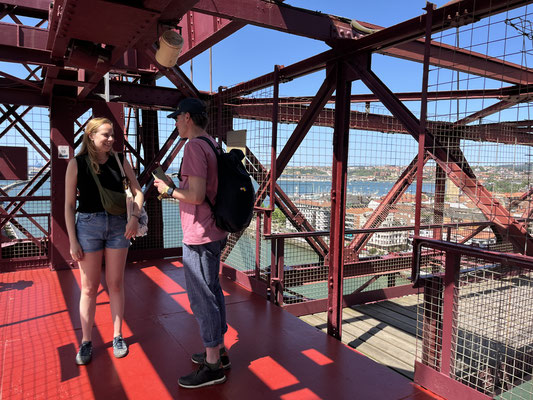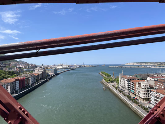 Wir laufen etwa 20 Min. bis zur Fähre, kaufen die Tickets (ohne Anstehen) und werden nach oben befördert. Auf dem Weg nach oben - im gläsernen Fahrstuhl - staunen wir nicht schlecht, wie hoch doch 50 m sein können. Als wir in luftiger Höhe aussteigen, weht es ziemlich doll. Hier oben ist alles vergittert, dennoch müssen Finia und ich uns erst einmal an die Höhe gewöhnen. Man hat einen wunderschönen Ausblick auf den Hafen sowie die Stadt Bilbao. Ein wirklich schönes Ausflugsziel.