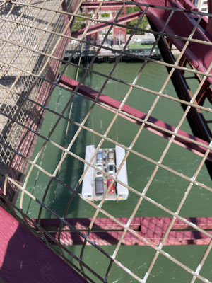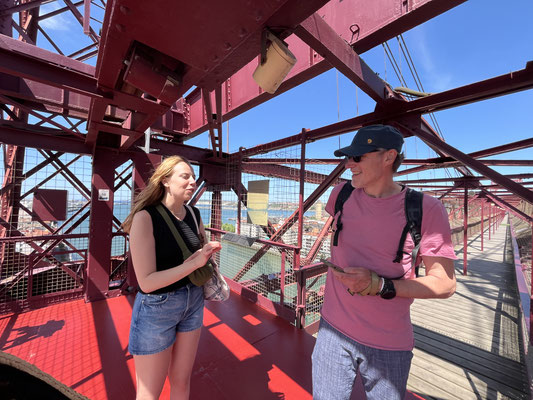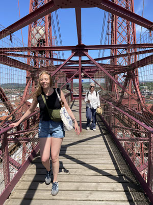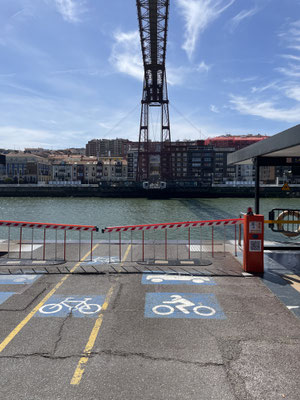 Zur Zeit ist ein Aufzug defekt, deshalb laufen wir auf der Brücke hin und wieder zurück, um im Anschluss mit der Schwebefähre auf die andere Uferseite zu gelangen.