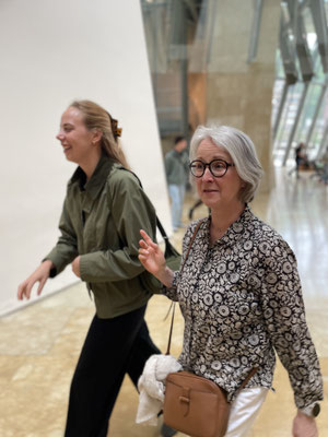 Wir nehmen den Bus, der direkt vor unserem Haus hält, um in die Innenstadt zu kommen. Heute haben alle Blumenläden auf, denn anders als in Deutschland, ist heute, am ersten Sonntag im Mai, Muttertag. Entgegen der Wettervorhersagen ist das Wetter heute in Ordnung, nicht besonders heiß, aber trocken. Wir freuen uns. In der Innenstadt angekommen machen wir uns auf kurzem Weg zum Guggenheim. Wir schauen uns zunächst das Gebäude von Außen an.