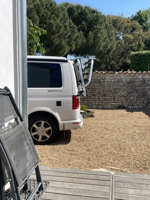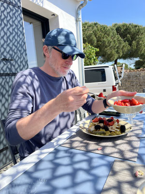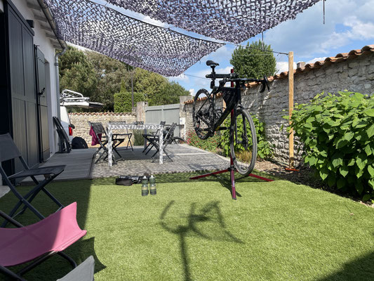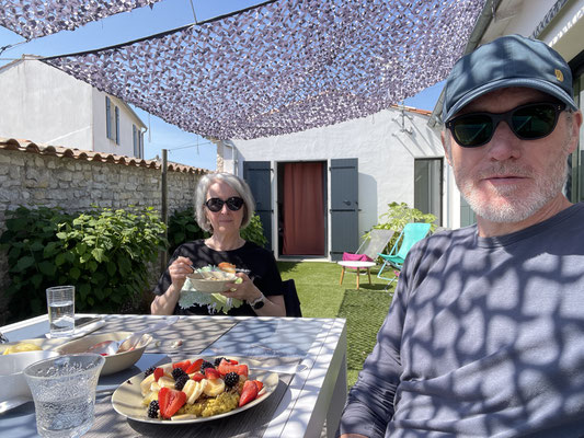 Die Sonne scheint! Und draußen ist es, bis auf einen kurzen Einsatz eines Trennschleifers in der Nachbarschaft, ruhig. Wir genießen es ausgiebig, Yoga machen zu können und draußen zu frühstücken. Danach machen wir die Bikes für die ersten Ausritte auf der Ile de Ré fertig. Dieses Mal getrennt. Ich fahre an die Nordspitze und Sonja fährt mit ihrem Rad Richtung Südstrand.