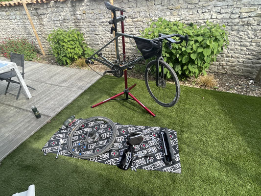 Kleines Problem während meiner Tour: Die Schaltung springt, was nervt. Deshalb gibt es nach der Tour noch einen spontanen Mechanikereinsatz. Ich tausche die Kassette am Rad und stelle die Schaltung neu ein. Auf dem Kunstrasen der Terrasse lässt sich das gut machen. ;o)