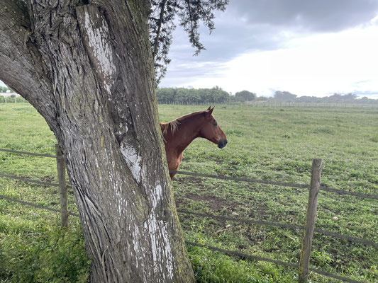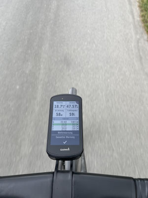Sonja fragt noch, ob wir unser Pausenbrot - ohne geht es keinen Schritt vor die Tür - noch unterwegs, bei einem kleinen Picknick zu uns nehmen wollen? Die Wolken sowie die Nachricht auf meinem Garmin raten allerdings dazu, dass Picknick eher zu Hause zu machen. Selbst die Pferde am Rand der Radstrecke haben sich schon untergestellt. ;o)