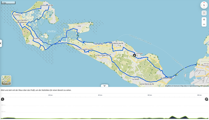 Ich bin in Sorge, denn ich befürchte, dass Marek und Eckhard im gebirgigen Berlin/Brandenburg trainieren und ich abgehängt werde, wenn wir das nächste Mal zusammen aufs Rad steigen. Ziele müssen deshalb dringend her. Was liegt näher, als die Insel einmal zu umrunden. Sonja will gerne im Haus bleiben, der Plan steht. Ick freu mir. Die ersten Kilometer sind mit den schon gefahrenen Routen identisch (deshalb dazu keine neuen Bilder). Später fahre ich die Südseite der Insel ab. Vorbei am Leuchtturm, dem südlichen Damm und der Küste und noch über die einzige Ergebung der Gegend, die Brücke nach La Rochelle. Da heute kein Wind weht ist es ein tolles Erlebnis.