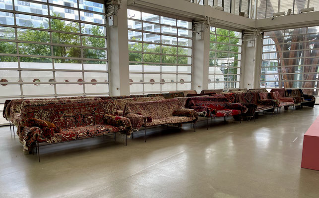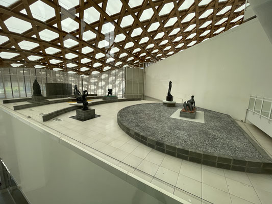 Die räumliche Ausstellungsgestaltung ist ein Spiel mit Formen und zyklischen Wegen. Gleichsam als Echo auf die sechseckige Architektur von Shigeru Ban und Jean de Gastines formiert sich der